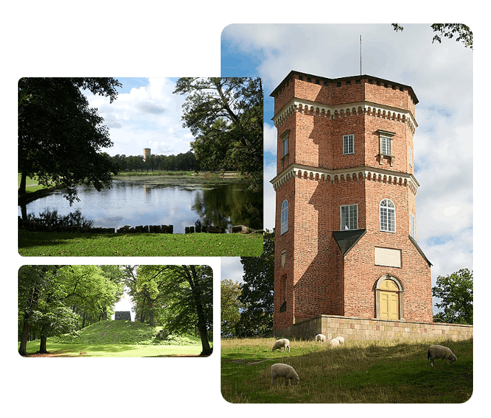 I den engelska parken möts du av ett mjukare landskap med lummiga träddungar, slingrande kanaler och vidsträckta gräsytor. Här finns historiska byggnadsverk som det Götiska tornet, placerade för att skapa vackra blickfång längs promenaden. Området bjuder på ett rikt djurliv med fåglar vid vattnet, och de stora fria ytorna är omtyckta för vila under ekarnas kronor. För dig som vill njuta av en måltid i det gröna finns det flera platser med fin utsikt. Vid det Götiska tornet hittar du öppna fält där kvällssolen dröjer sig kvar länge, vilket ger en rofylld stämning mot slutet av dagen. Vid Monumentholmen kan du sitta nära vattnet med blicken mot kanalerna, det skapar en naturnära känsla mitt i den kungliga miljön.